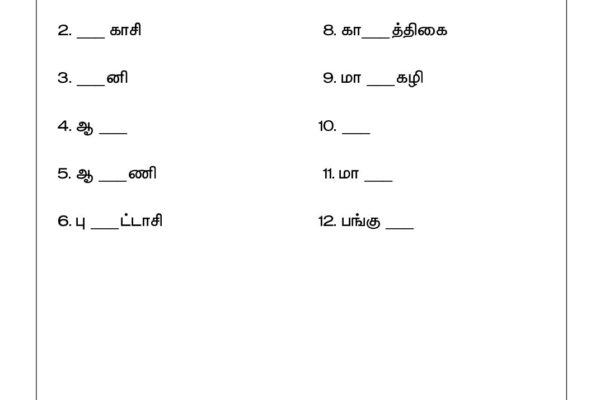 Tamil – Grade 2 Worksheet – Tamil Months Names – Fill the Missing Letters $0.00 Price tryworksheets Author August 28, 2025 Publish Date 31 Download Count More Details