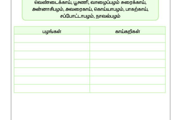 Tamil – Grade 2 Worksheet – Fruits and Vegetables Names – Sorting $0.00 Price tryworksheets Author August 28, 2025 Publish Date 29 Download Count More Details