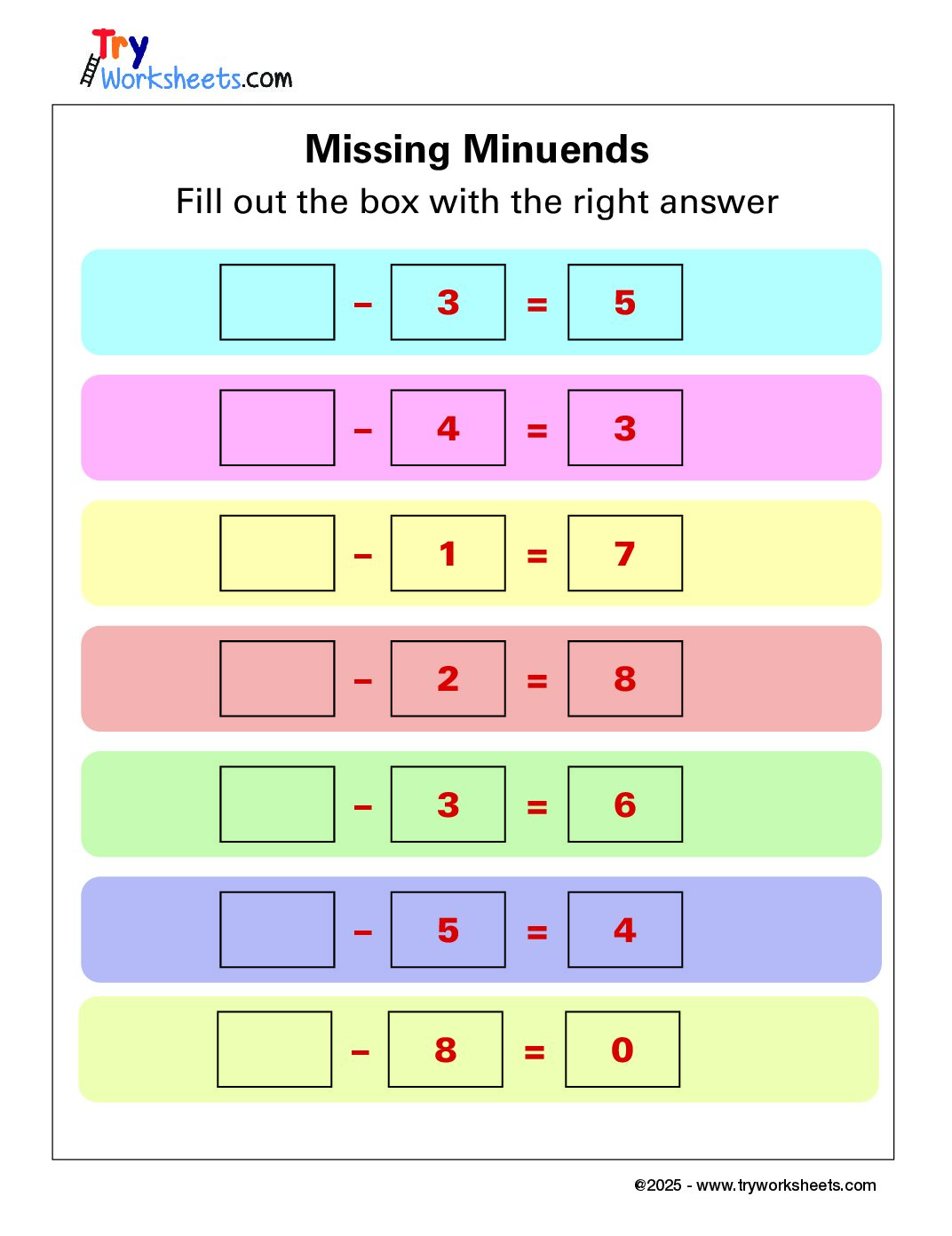 Math Grade 1 – Missing Minuends Worksheet with Fill-in Answers