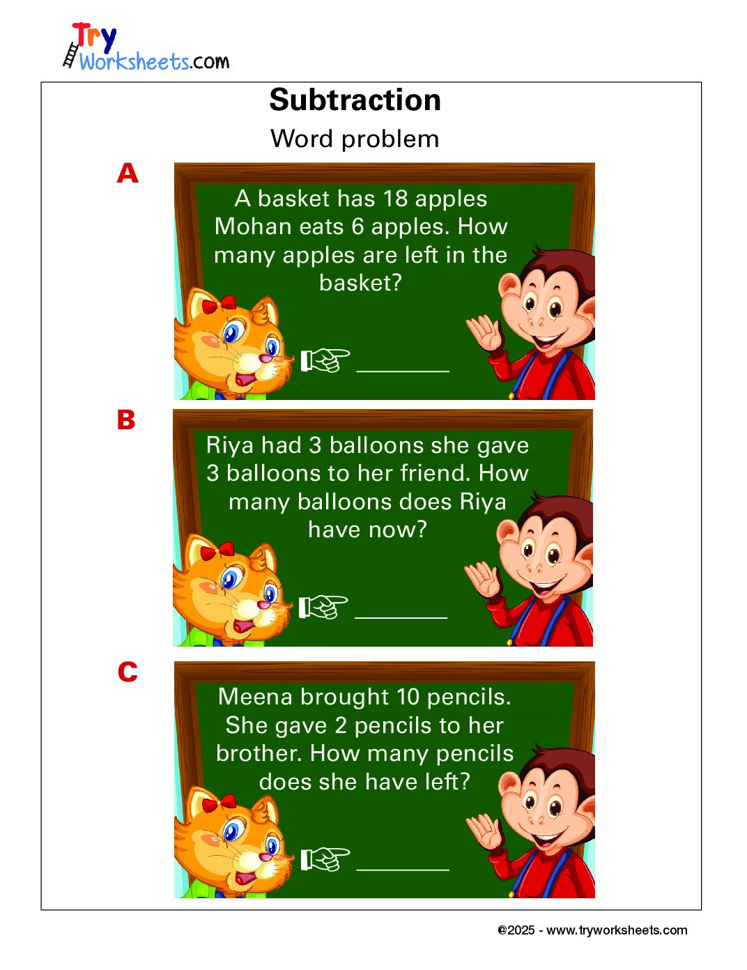 Math Grade 1 – Subtraction Word Problem Worksheets for Kids