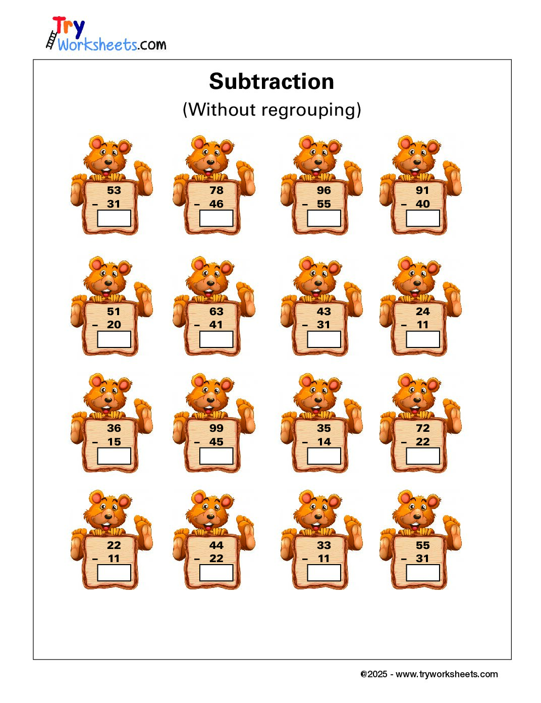Subtraction Worksheet (Without Regrouping) for Grade 1